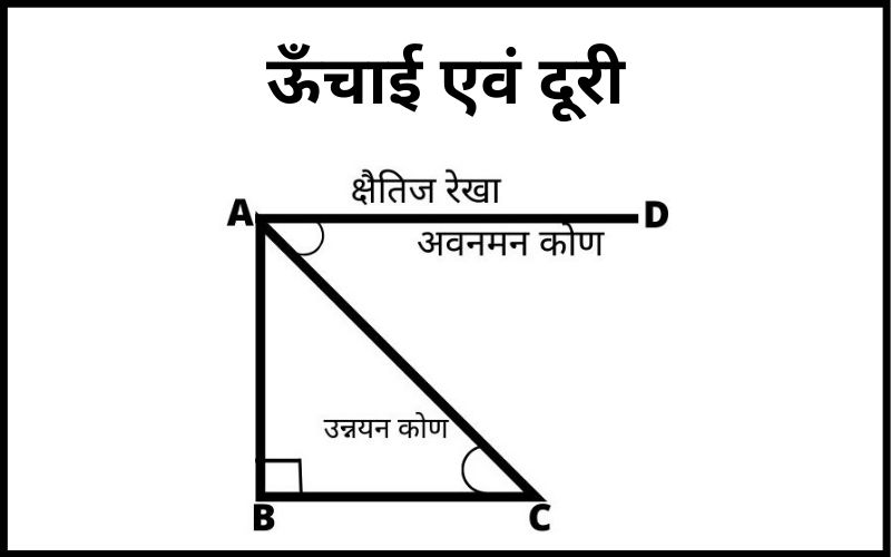 चित्र में दर्शाए अनुसार AB(ऊंचाई) ज्ञात करने के लिए अगर BC(आधार की लंबाई) और कोण C ज्ञात हो तो त्रिकोणमितीय अनुपात tanC=AB(ऊंचाई)/BC(आधार) से AB= tanC x BC होगा।